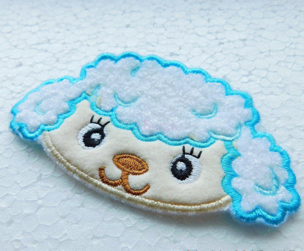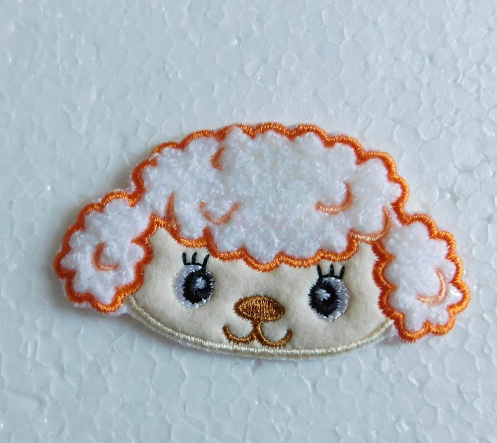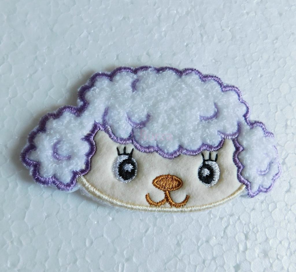 aplikácia, nášivka pevná a kvalitná, ovečka akoby jemne kožušinková, 10cm v šírke a cca 6cm vo výške, krásna na čiapočku, oblečenie, na dečku, poteší malé bambuľky , viac kusov aplikácií zlava, aj vo farbe fialová a oranžová, krásne, kvalitné z dovozu